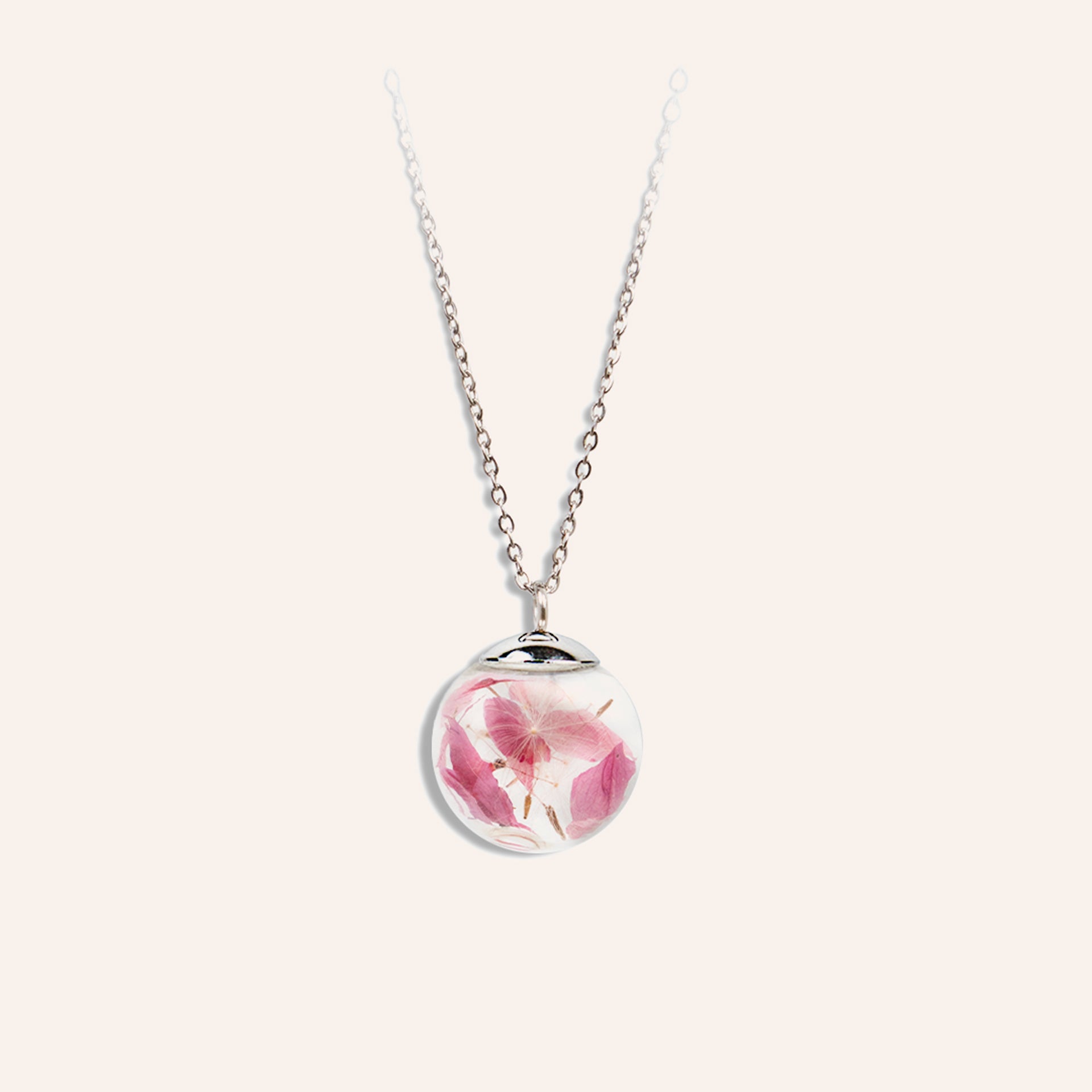 Un accessorio raffinato e significativo, ideale per chi ama la natura. La collana è lunga 64 cm ed è realizzata in acciaio inossidabile anallergico certificato AISI 316, perfetta anche per le pelli più sensibili. L'ampolla in resistente vetro soffiato temprato, contiene fiori di Ciliegio Giapponese essiccati naturalmente.
