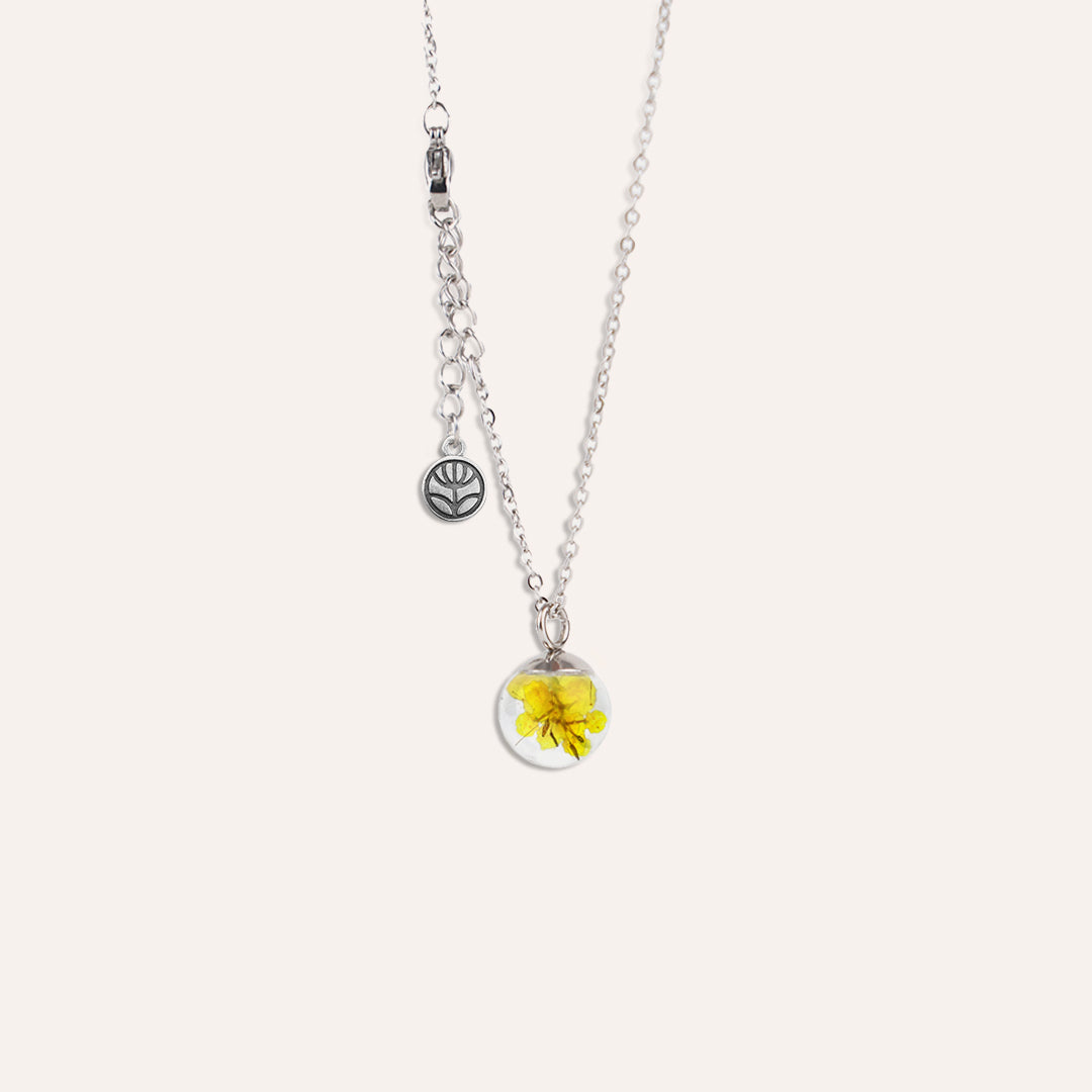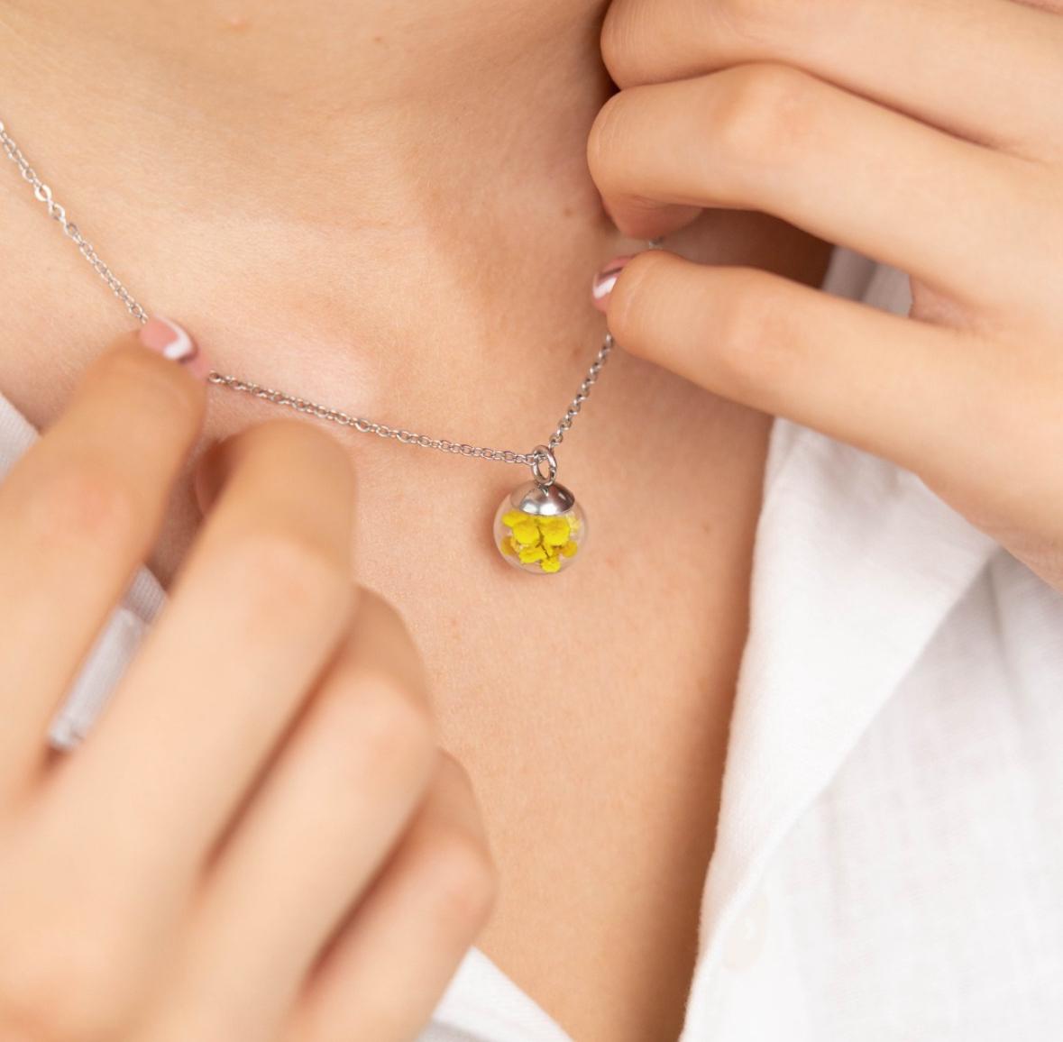 Materiali: acciaio inossidabile anallergico certificato AISI 316, vetro soffiato temprato fiori essiccati di Mimosa e semi di tarassaco biologici.